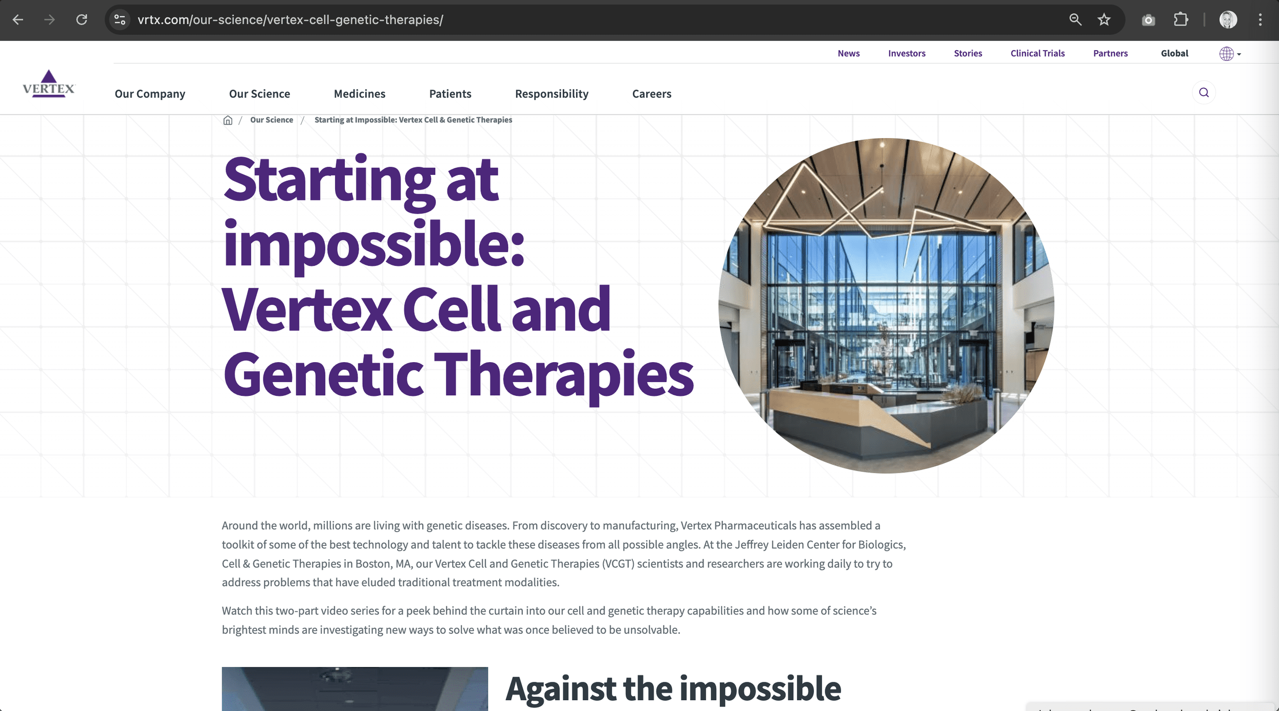 Vertex is a visionary research biotech that stands apart from their pharmaceutical counterparts. The small but mighty company was able to find a cure for cystic fibrosis – a disease area many others had sworn was “impossible” to cure.
